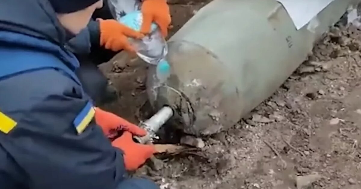 Στο βίντεο, που κοινοποιήθηκε διαδικτυακά από τις ουκρανικές ένοπλες δυνάμεις την Τετάρτη, φαίνονται δύο άνδρες να προσπαθούν να εξουδετερώσουν την τεράστια ρωσική βόμβα μόνο με τα χέρια τους.