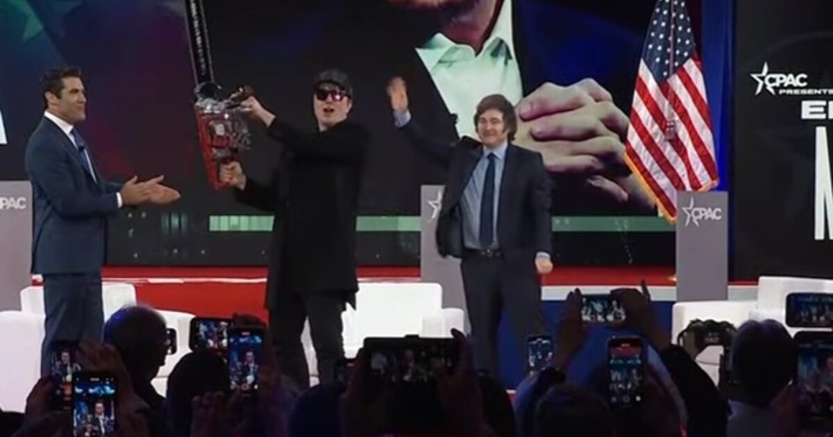 Ο Μιλέι ενώ πριν γίνει πρόεδρος της Αργεντινής στα τέλη του 2023 συχνά κρατούσε ένα αλυσοπρίονο στις προεκλογικές συγκεντρώσεις ως σύμβολο της προσπάθειάς του να μειώσει το μέγεθος της κυβέρνησης.