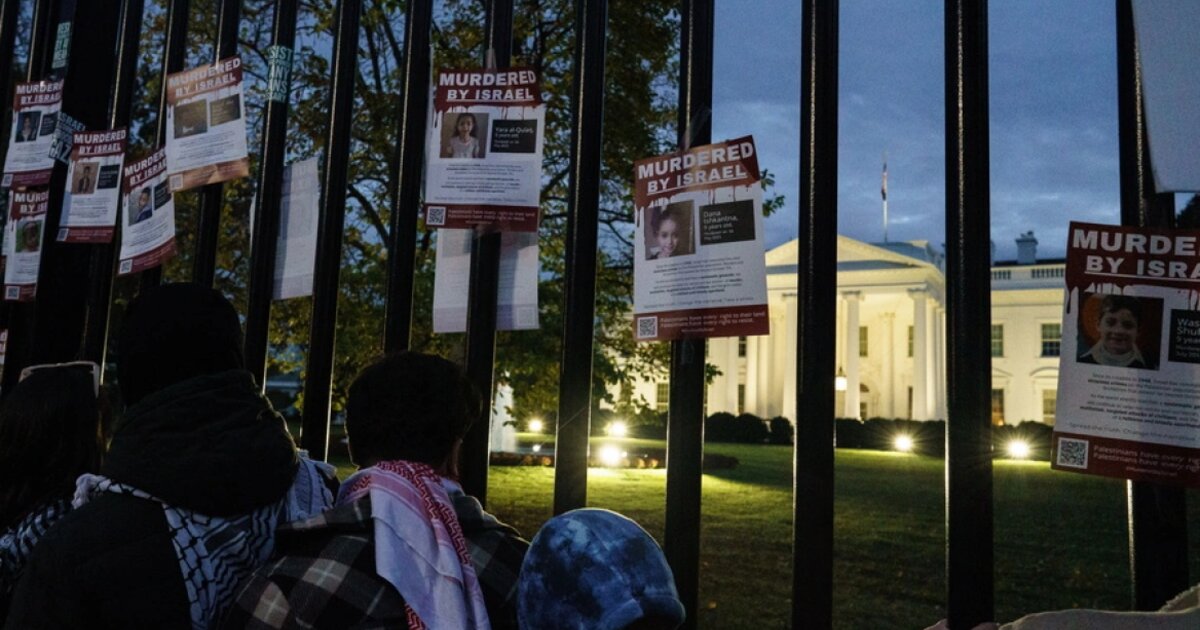 Δημοσιογράφος της εφημερίδας New York Post κοινοποίησε βίντεο στην πλατφόρμα X στο οποίο διακρίνονται διαδηλωτές με κόκκινη μπογιά στα χέρια να κουνάνε τα κιγκλιδώματα έξω από τον Λευκό Οίκο και να φωνάζουν συνθήματα εναντίον του προέδρου Τζο Μπάιντεν.