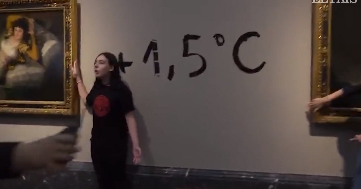 Ένας άντρας και μια γυναίκα κόλλησαν το χέρι τους στο έργο "Η Ντυμένη Μάχα" του Γκόγια και στο έργο "Η Γυμνή Μάχα" του ιδίου και έγραψαν με μαρκαδόρο στον τοίχο μεταξύ των δύο πινάκων "+1,5 C" , όπως φαίνεται από βίντεο.