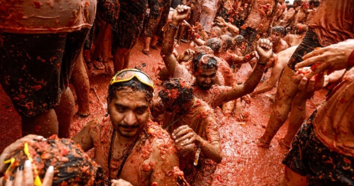 Οι δρόμοι του Μπουνιόλ, στην ανατολική Ισπανία, βάφτηκαν κόκκινοι σήμερα, καθώς χιλιάδες κάτοικοι και επισκέπτες επιδόθηκαν σε ντοματοπόλεμο, εκτοξεύοντας υπερώριμες ντομάτες στο παραδοσιακό φεστιβάλ «Τοματίνα».