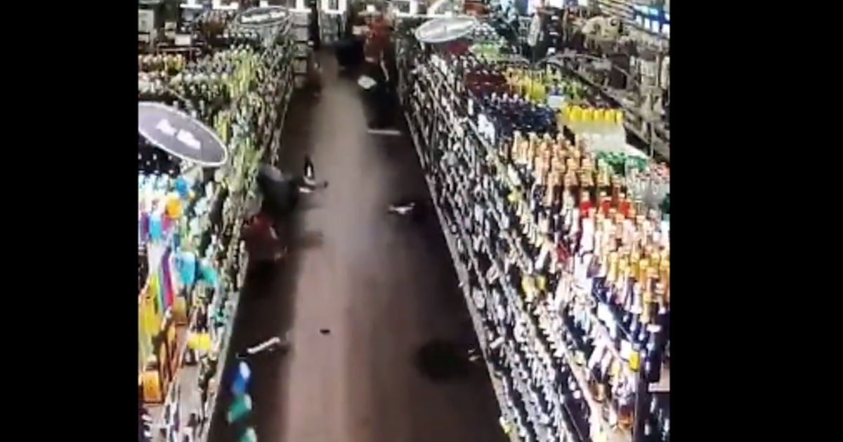 Footage shows bottles fall off liquor store shelves as a strong earthquake hit the Northern California coast.