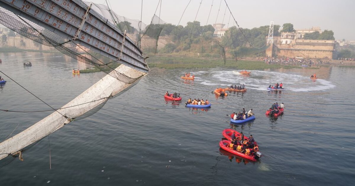 Η γέφυρα της εποχής της αποικιοκρατίας που συνέδεε τις όχθες του ποταμού Ματσού, στην πόλη Μόρμπι, ήταν γεμάτη κόσμο, εν μέσω του φεστιβάλ Ντιβάλι, της γιορτής "του φωτός", όταν κατέρρευσε το βράδυ της Κυριακής, με αποτέλεσμα εκατοντάδες άνθρωποι να πέσουν ο ένας πάνω στον άλλο και στα νερά του ποταμού από ύψος κάπου δέκα μέτρων.