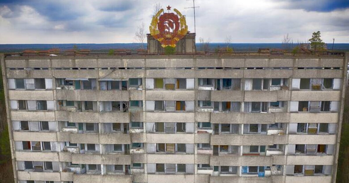 Το σκουριασμένο έμβλημα της Σοβιετικής Ένωσης σε εγκαταλελειμμένο κτίριο στην πόλη-φάντασμα Πριμγιάτ κοντά στον πυρηνικό σταθμό του Τσερνόμπιλ