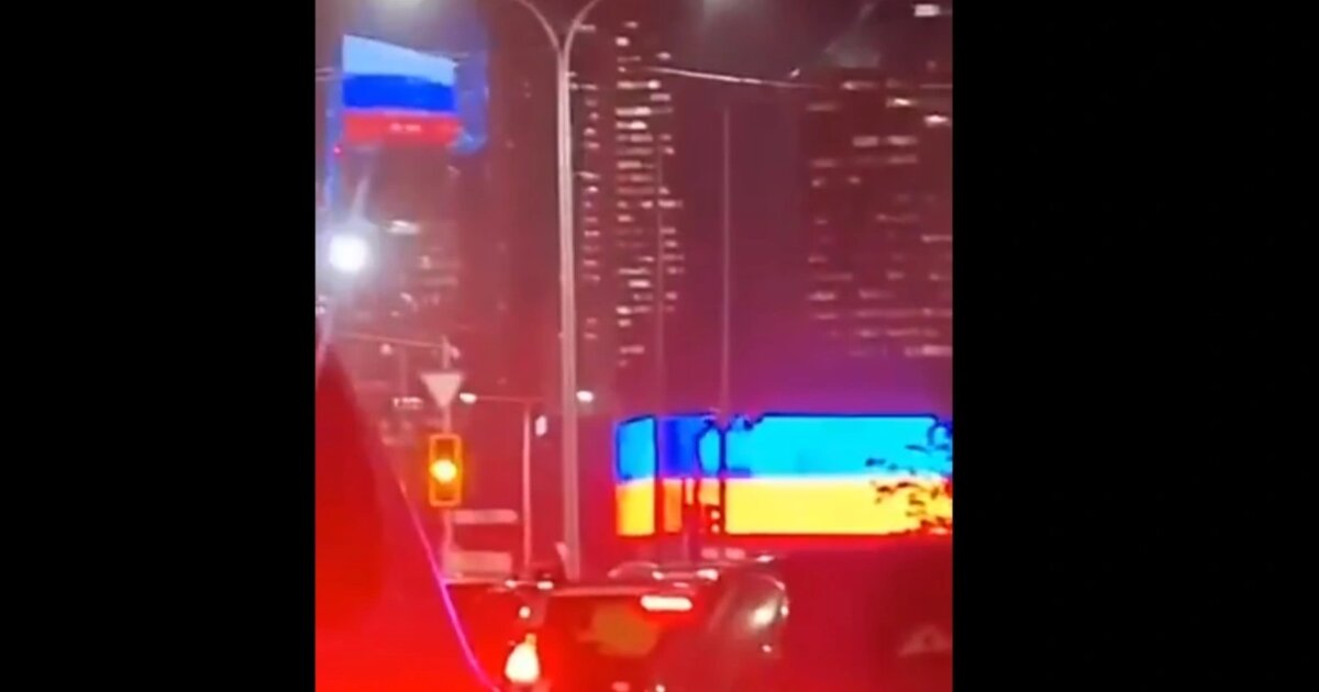 Η σημαία της Ουκρανίας, με τις οριζόντιες λωρίδες μπλε και κίτρινο, εμφανίσθηκε για λίγο αργά χθες, Τετάρτη, αντί της ρωσικής τρίχρωμης σημαίας με άσπρο μπλε και κόκκινο, σε οθόνη που βρίσκεται σε μία από τις κύριες οδικές αρτηρίες της Αστανά.