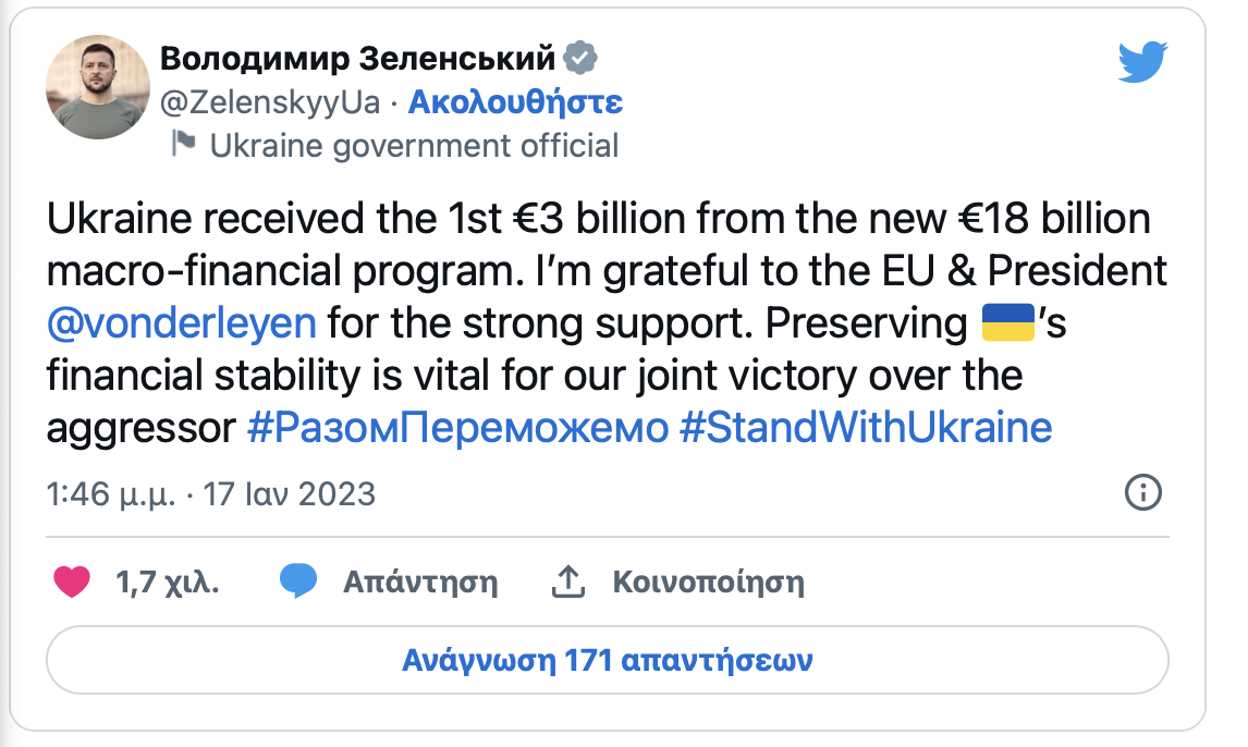 "Η Ουκρανία έλαβε τα τρία πρώτα δισεκατομμύρια ευρώ από το νέο μακροοικονομικό πρόγραμμα των 18 δισεκατομμυρίων ευρώ" στήριξης της ουκρανικής οικονομίας, ανέφερε ο Ουκρανός πρόεδρος στο Twitter
