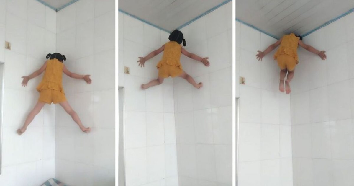 Ένα μικρό κορίτσι δυνητικός... spiderman, ανεβαίνει και κατεβαίνει έναν τοίχο με μεγάλη ευκολία χρησιμοποιώντας τα γυμνά χέρια και τα πόδια της.