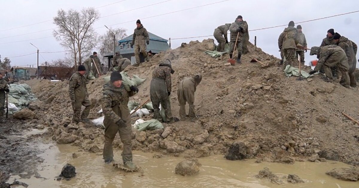 Στο Καζακστάν, οι άνθρωποι εργάζονταν όλη τη νύχτα για να κατασκευάσουν αναχώματα και να ενισχύσουν τις επιχωματώσεις.