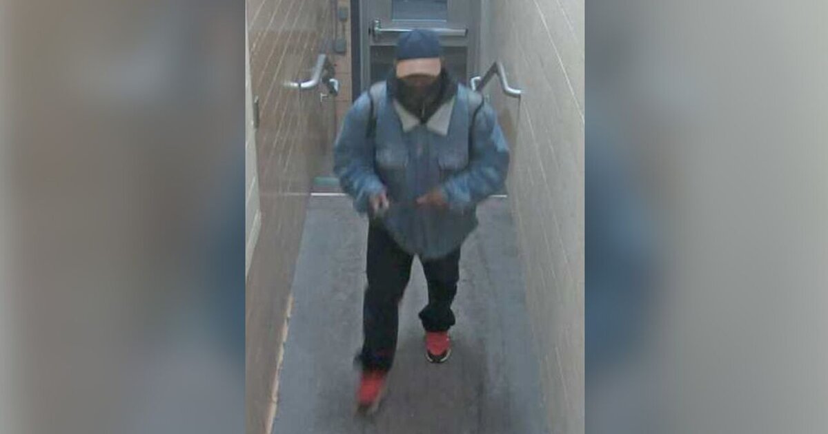 Στα στιγμιότυπα διακρίνεται μαύρος άνδρας που φοράει καπέλο, μάσκα, τζιν πανωφόρι και κόκκινα αθλητικά παπούτσια.