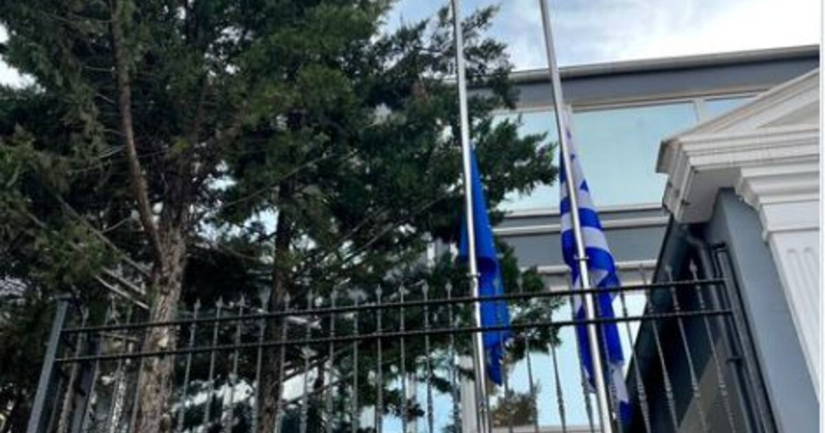 Μεσίστια κυματίζει η ελληνική σημαία, στην πρεσβεία της Ελλάδας στην Τουρκία, ως ένδειξη πένθους για το πολύνεκρο σιδηροδρομικό δυστύχημα στα Τέμπη.