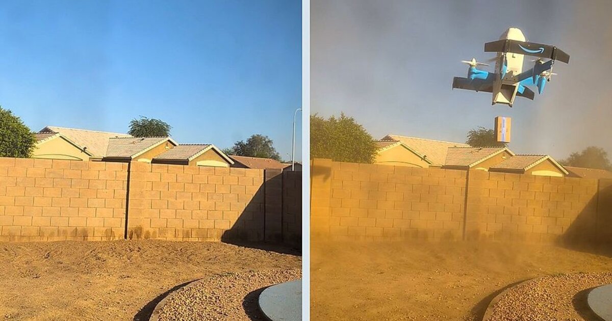 Κάπως έτσι, μια παραγγελία κατέφθασε σε σπίτι στο Φοίνιξ της Αριζόνα, στις 26 Μαΐου, λίγο... άκομψα καθώς το drone "έφτυσε" το πακέτο και ανάγκασε τους παραλήπτες να προφυλαχθούν από τον στρόβιλο σκόνης που δημιουργήθηκε...