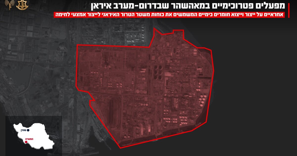 «Η Πολεμική Αεροπορία, υπό την καθοδήγηση της Διεύθυνσης Πληροφοριών και σε συνεργασία με τη Διεύθυνση Στρατιωτικών Πληροφοριών, επιτέθηκε νωρίτερα σήμερα σε υποδομές στο συγκρότημα πετροχημικών που είναι υπεύθυνο για την παραγωγή και εξαγωγή χημικών υλικών στις ένοπλες δυνάμεις που υπόκεινται στο καθεστώς στη Μαχσάχρ, στο νοτιοδυτικό Ιράν. Στο πλαίσιο των επιθέσεων, δέχτηκε επίθεση μια τοποθεσία όπου είχε δημιουργηθεί μία από τις δύο κεντρικές υποδομές που χρησιμοποιούνταν για την παραγωγή υλικών για εκρηκτικά, βαλλιστικών πυραύλων και άλλων όπλων. Η τοποθεσία είναι μία από τις κύριες τοποθεσίες όπου παράγεται το απαραίτητο υλικό για βαλλιστικούς πυραύλους», ανέφερε.
