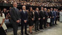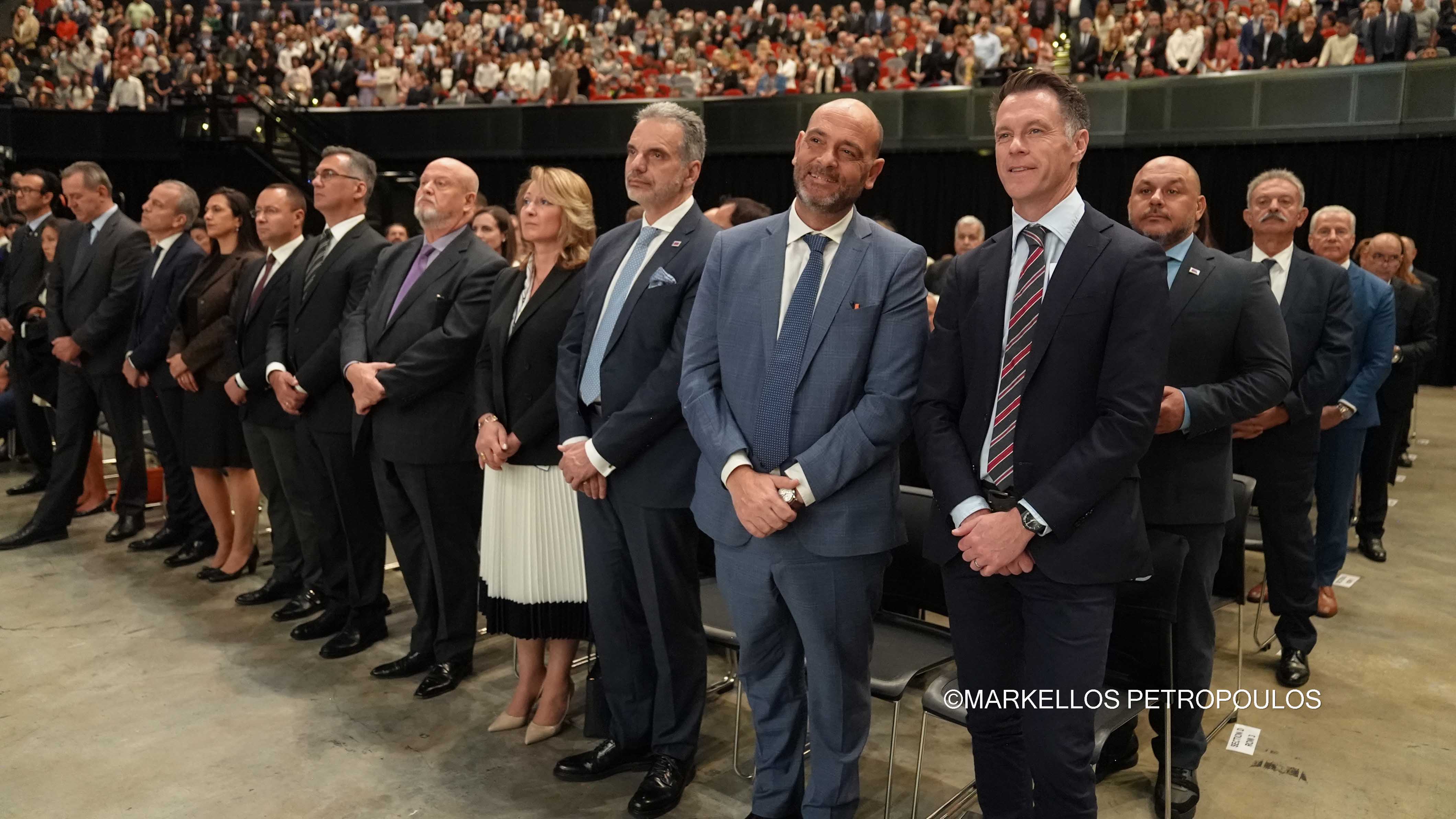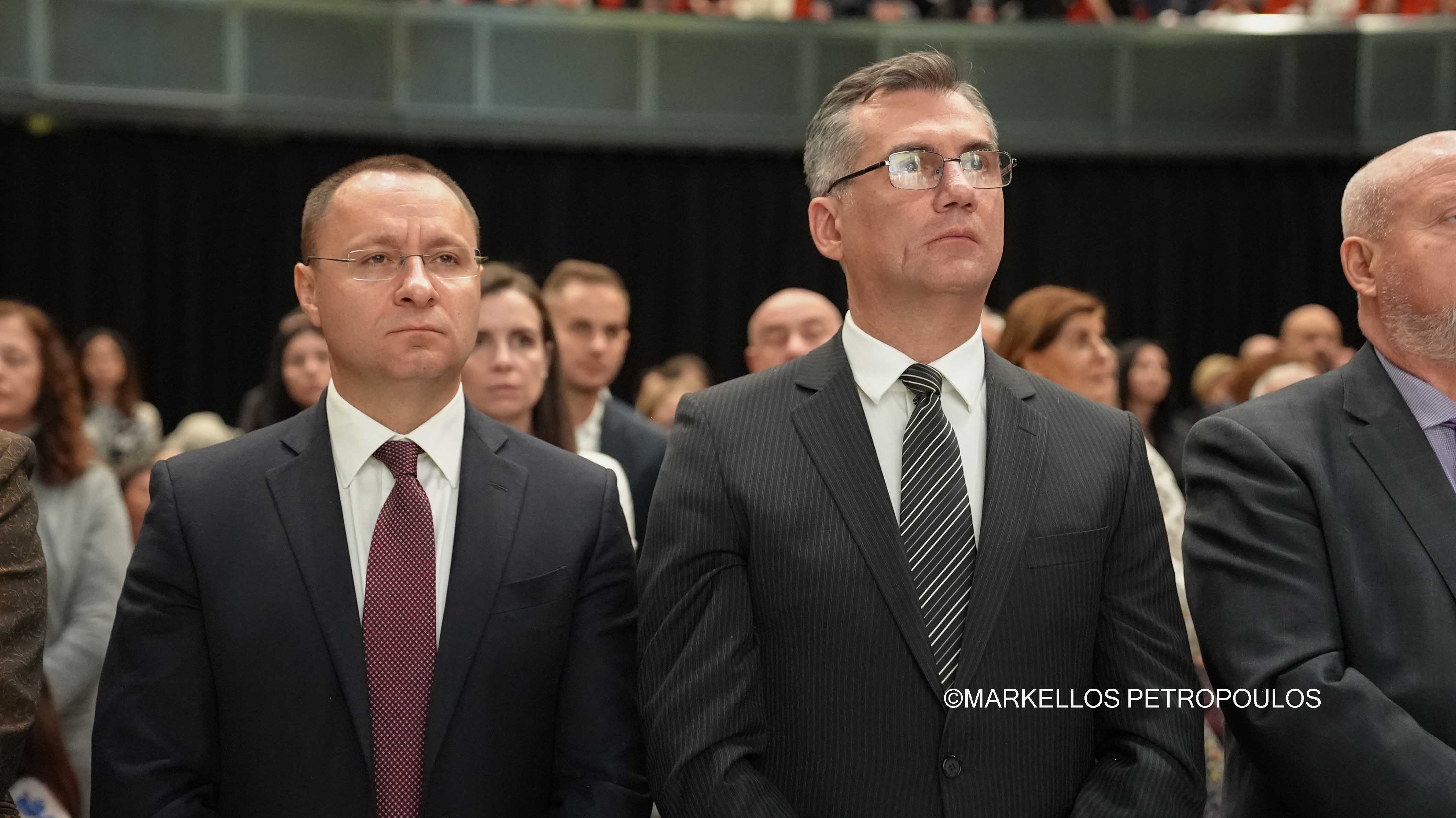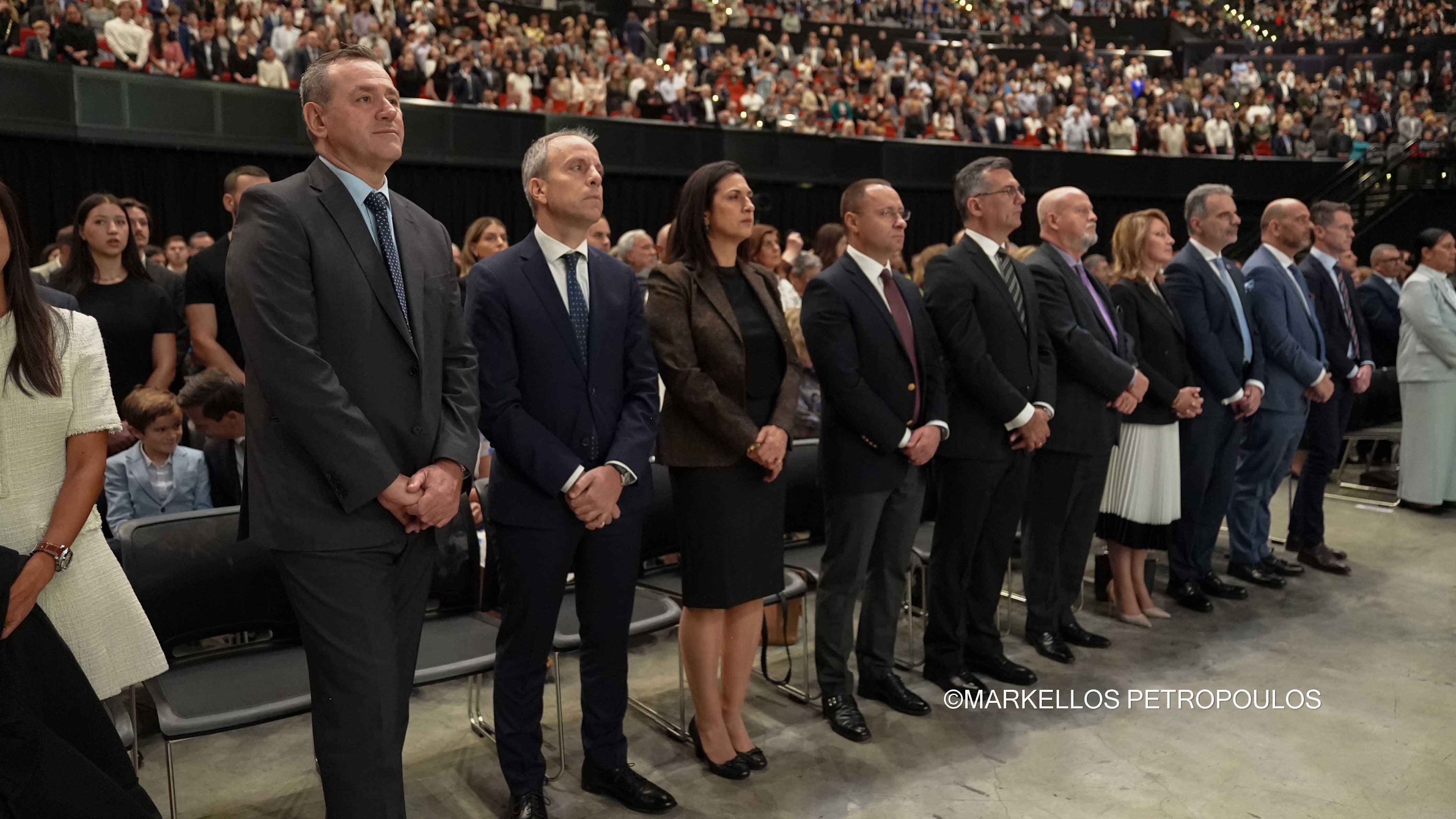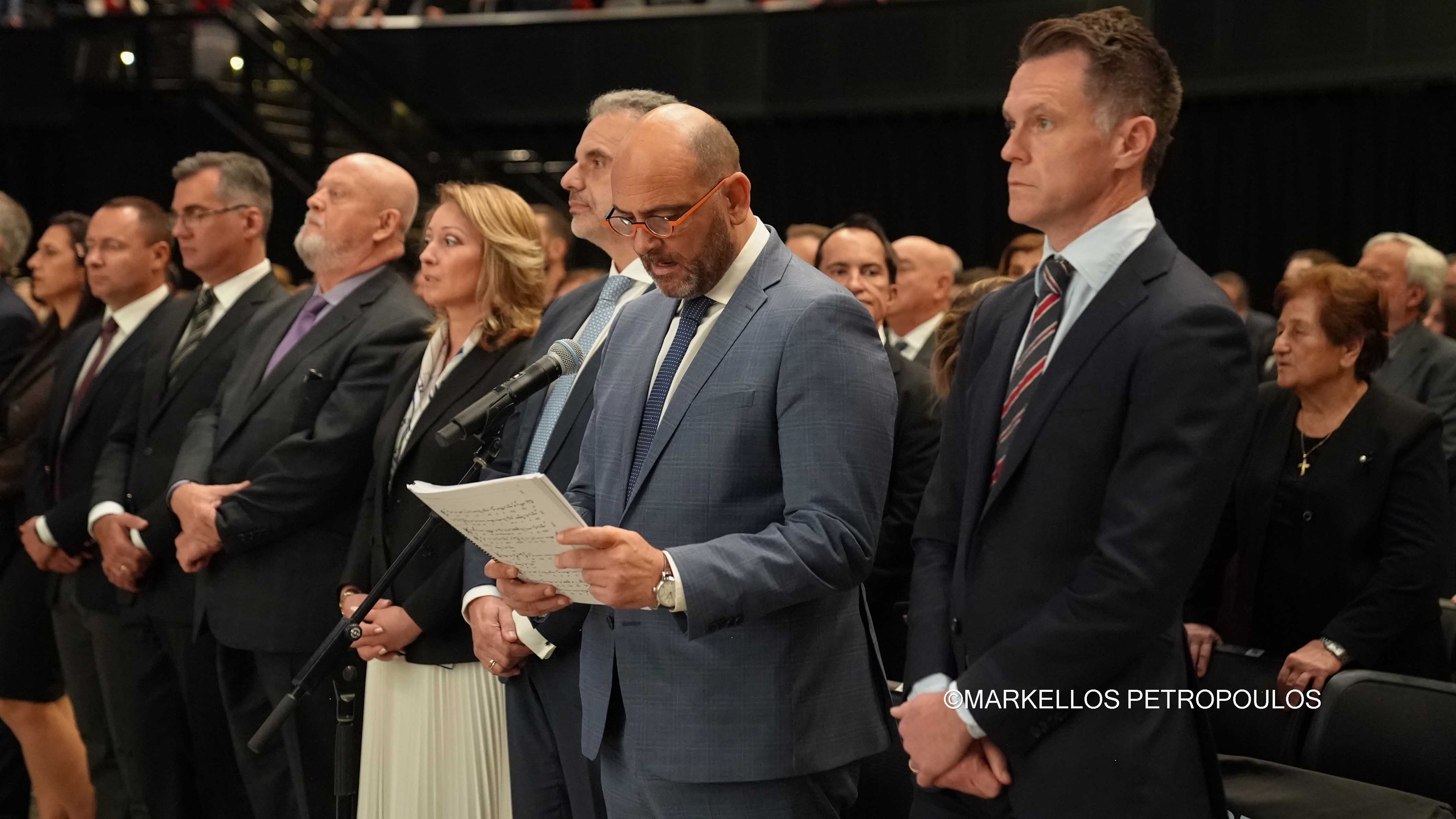 Στην ιστορική Θεία Λειτουργία επί τω εορτασμώ της εκατονταετηρίδος της Ιεράς Αρχιεπισκοπής Αυστραλίας, η οποία τελέστηκε προεξάρχοντος του Προκαθημένου της Ορθοδόξου Εκκλησίας κ.κ. Βαρθολομαίου και συλλειτουργούντων του Σεβασμιωτάτου Αρχιεπισκόπου Αυστραλίας κ. Μακαρίου, των Θεοφιλεστάτων Επισκόπων, μελών της Ιεράς Επαρχιακής Συνόδου, των Σεβασμιωτάτων και Θεοφιλεστάτων Ιεραρχών: Δέρβης κ. Ιεζεκιήλ, Σεβαστείας κ. Σεραφείμ, Ίμβρου και Τενέδου, κ. Κυρίλλου, Μιλητουπόλεως κ. Ιακώβου, Μαγνησίας κ. Χριστοδούλου και Νικοπόλεως κ. Θεμιστοκλή (Πατριαρχείο Αλεξανδρείας), και κληρικών και μοναχών της Ιεράς Αρχιεπισκοπής Αυστραλίας, παρίσταντο, μεταξύ άλλων, ο Πρωθυπουργός της Νέας Νοτίου Ουαλίας, κ. Chris Minns, Υπουργός Μικρών Επιχειρήσεων, Περιουσίας και Πολυπολιτισμικότητος ΝΝΟ, κ. Steve Kamper, άλλοι Αυστραλοί Υπουργοί, Βουλευτές και Γερουσιαστές, ο Υφυπουργός Πολιτισμού της Ελλάδος, κ. Ιάσων Φωτήλας, εκπροσωπών την Ελληνική Κυβέρνηση, Πρέσβεις και Πρόξενοι, Άρχοντες της Μ.τ.Χ.Ε., και οι γονείς του Αρχιεπισκόπου Αυστραλίας, Εμμανουήλ και Φωτεινή Γρινιεζάκη.