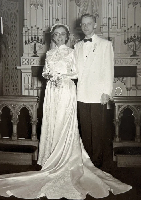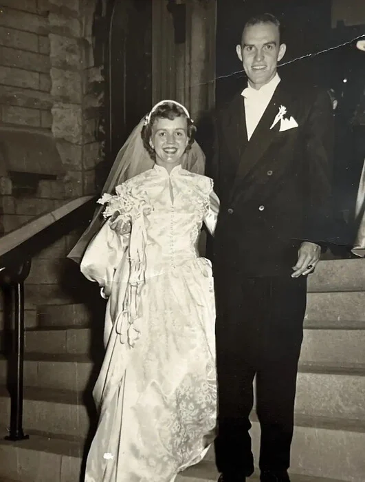 «Είναι ένα πολύ κλασικό νυφικό, με όμορφο κορσέ, μάο γιακά και πολλά κουμπιά. Όταν αγγίζεις το υψηλής ποιότητας σατέν, καταλαβαίνεις πως είναι ανώτερο τού μέσου όρου» λέει η αδερφή της Αντέλ, η 90χρονη σήμερα Ελεανόρ Λάρσον Μίλτον που ήταν παράνυμφος στον γάμο του '50. Κι όταν ήρθε η δική της ώρα να παντρευτεί, ήξερε ακριβώς τι να φορέσει.