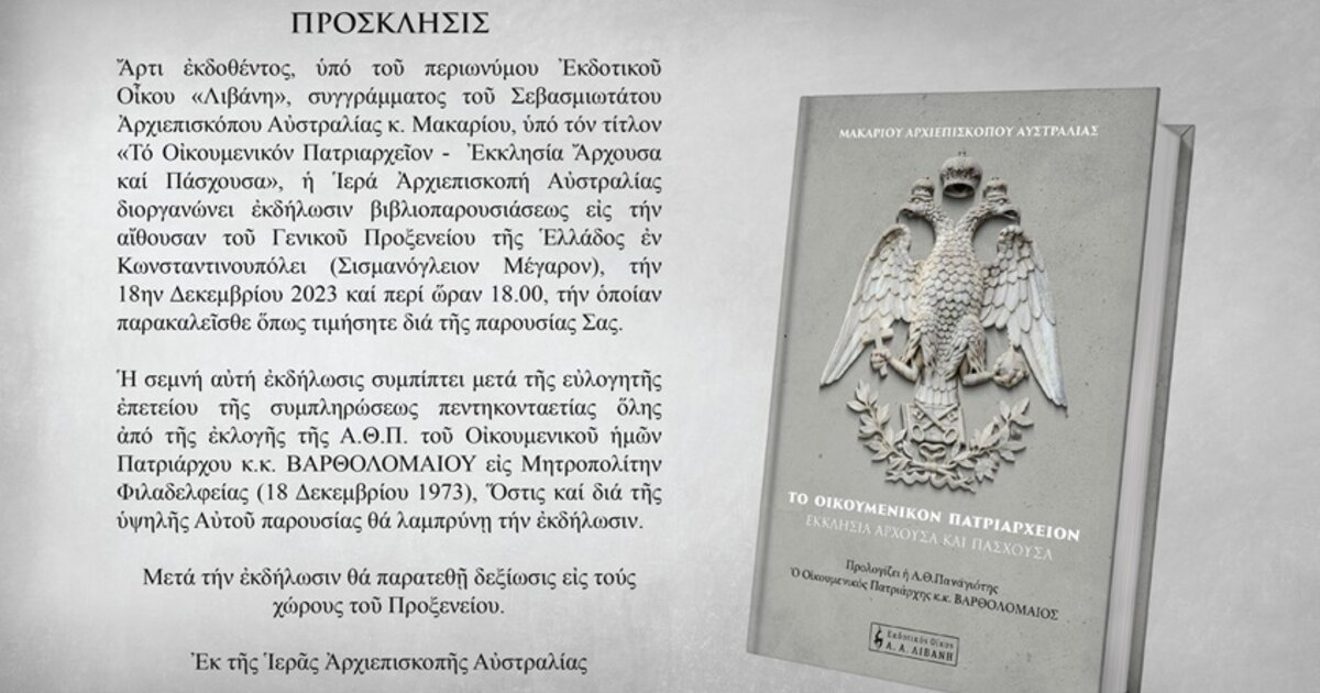 «Το Οικουμενικόν Πατριαρχείον - Εκκλησία Άρχουσα και Πάσχουσα»: Το νέο βιβλίο του Αρχιεπισκόπου Αυστραλίας
