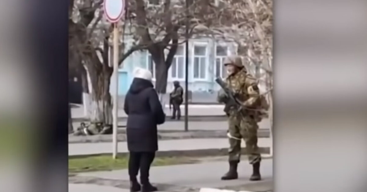 Μία γυναίκα μεγάλης ηλικίας από την Ουκρανία δεν φοβήθηκε, στάθηκε μπροστά από έναν πάνοπλο Ρώσο στρατιώτη.