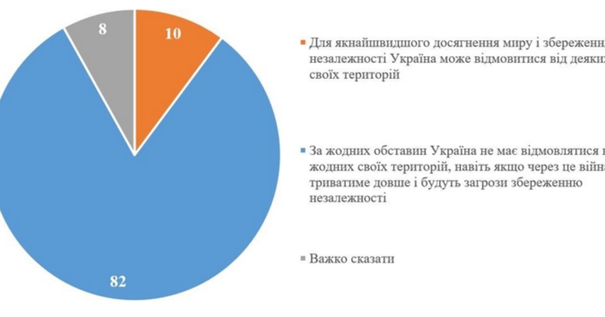 Το 82% των Ουκρανών πιστεύει ότι η Ουκρανία δεν πρέπει σε καμία περίπτωση να παραχωρήσει κανένα από τα εδάφη της στο πλαίσιο μιας ειρηνευτικής συμφωνίας με τη Ρωσία, σύμφωνα με νέα έρευνα ενός από τα πιο έγκυρα δημοσκοπικά ινστιτούτα της Ουκρανίας.
