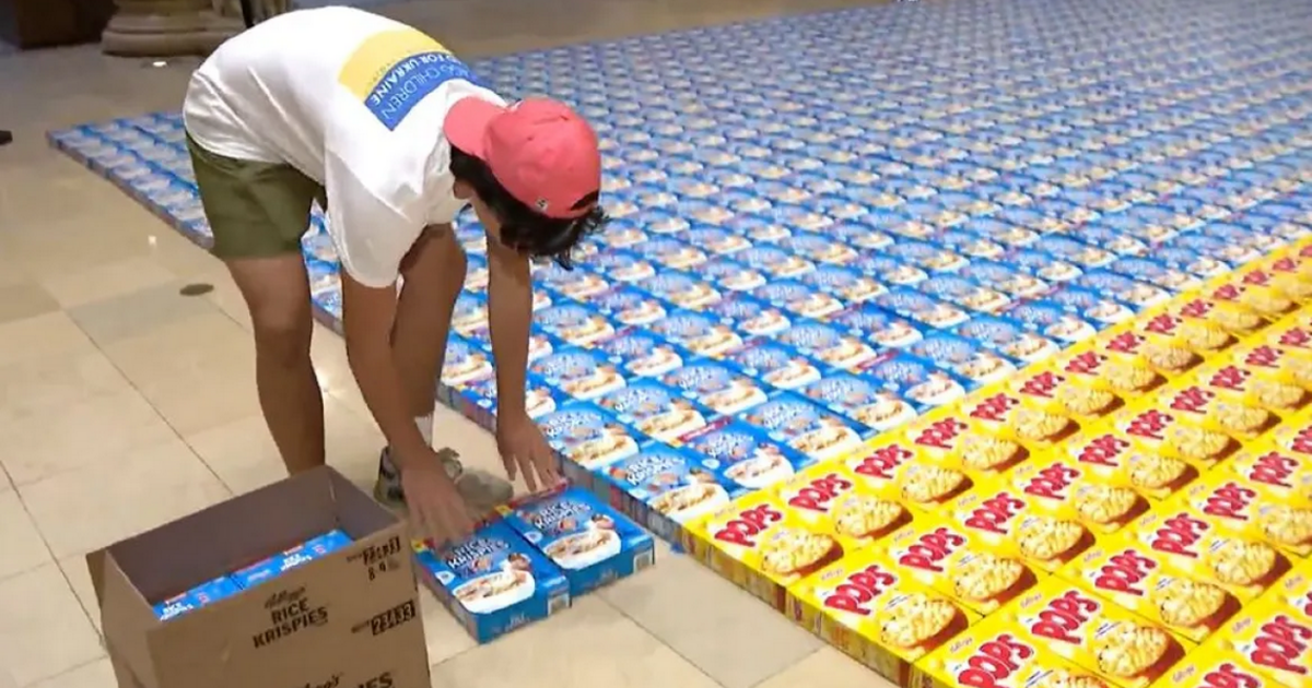Χρησιμοποίησαν κίτρινες συσκευασίες Corn Pops και μπλε Rice Krispies για να αναπαραστήσουν την ουκρανική σημαία.