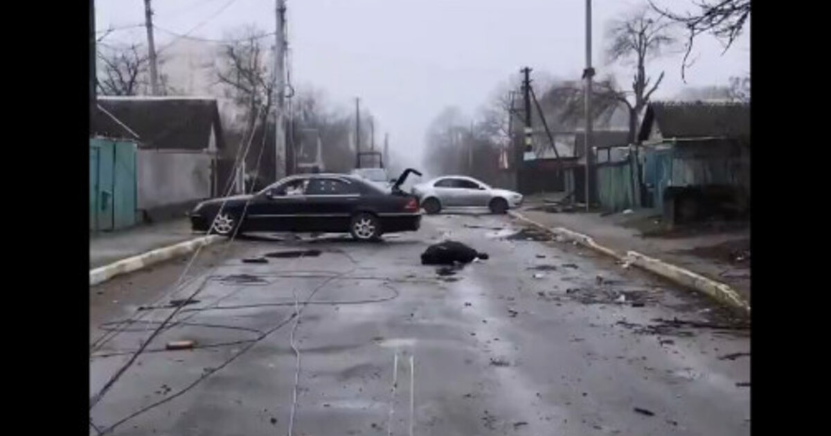 Ένα ασημί αυτοκίνητο γεμάτο τρύπες από σφαίρες, ένα άλλο μερικώς συνθλιμμένο, ενώ ένα πυρπολημένο βαν βρίσκεται κοντά σε πολλά πτώματα. «Αυτές είναι οι συνέπειες της ρωσικής κατοχής», λέει ο δήμαρχος.