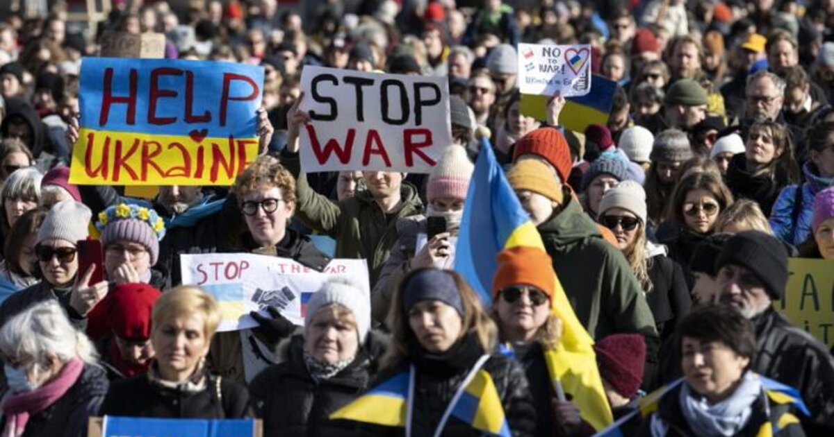 Το πλήθος φώναξε συνθήματα όπως «Όχι στον πόλεμο» και «Ο Πούτιν είναι μαλ...ς», ενώ κυμάτιζαν σημαίες της Ουκρανίας.