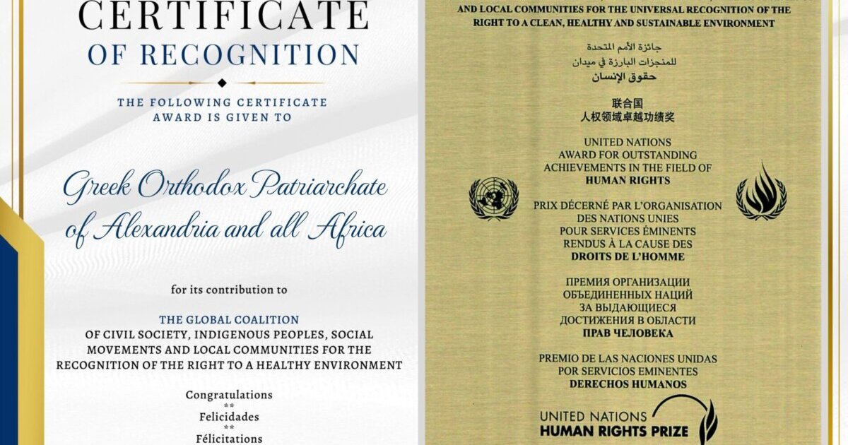 Μιας σημαντικής αναγνώρισης έτυχε προσφάτως το Πατριαρχείο Αλεξανδρείας και πάσης Αφρικής από τον Οργανισμό Ηνωμένων Εθνών. Πρόκειται για το Πιστοποιητικό αναγνώρισεως εκ μέρους του ΟΗΕ των προσπαθειών του Πρεσβυγενούς Πατριαρχείου υπέρ της προστασίας του περιβάλλοντος και της αντιμετωπίσεως των προβλημάτων, τα οποία προκύπτουν από την Κλιματική Αλλαγή.