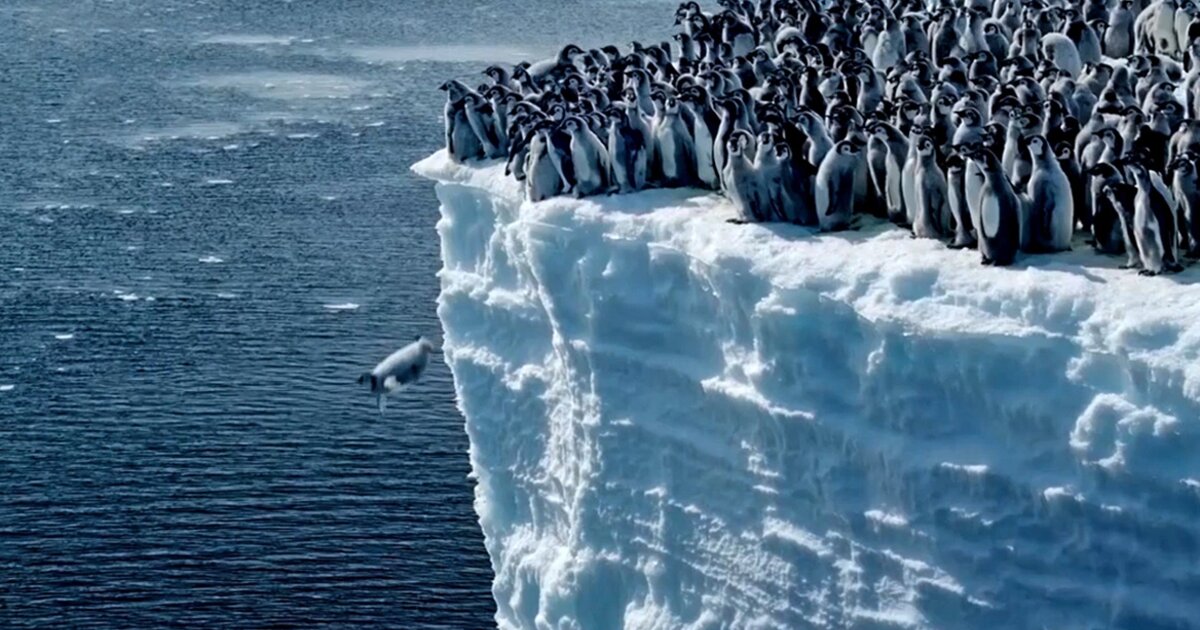 Στο βίντεο που ανήρτησε στο YouTube το National Geographic εμφανίζονται τα πιγκουινάκια να πλησιάζουν διστακτικά το χείλος του γκρεμού. Ξαφνικά, ένα από αυτά πηδάει στο κενό και πέφτει στο νερό με έναν παφλασμό. Λίγη ώρα αργότερα εμφανίζεται να κολυμπάει σώο και αβλαβές. Το παράδειγμά του ακολουθούν και άλλοι νεοσσοί, βουτώντας από ψηλά για να απολαύσουν το πρώτο τους μπάνιο.