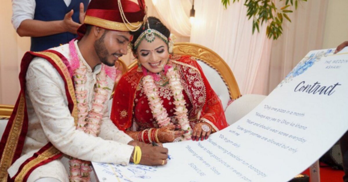 Πρόκειται για μια λίστα που συνέταξαν οι φίλοι τους και προφανώς δεν είναι νομικά δεσμευτική. Αλλά, έγινε viral. Κυρίως για τον όρο σχετικά με την πίτσα. Η Σάντι Πρασάντ και ο Μίντου Ράι παντρεύτηκαν σε μια παραδοσιακή τελετή στο Γκουγουαχάτι, στην πολιτεία Άσαμ της Ινδίας.