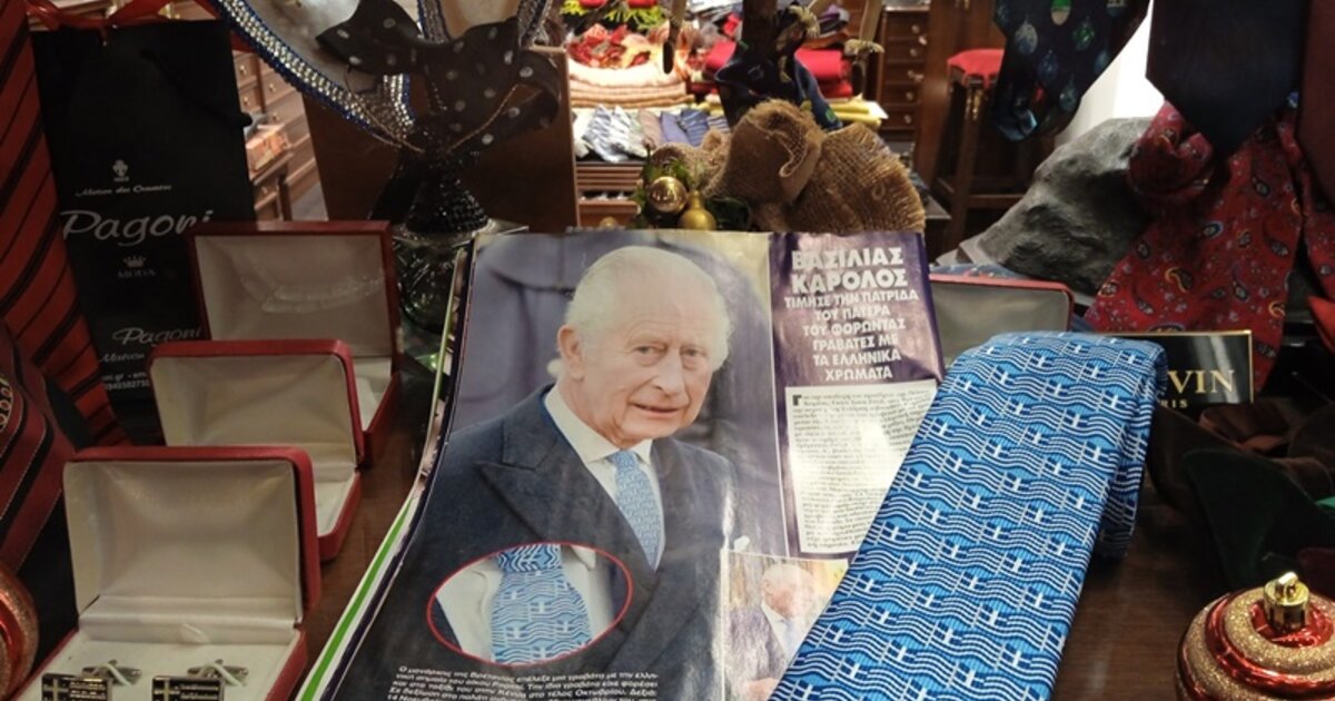 «Αυτή τη γραβάτα την αγόρασε από το κατάστημά μας η ιδιοκτήτρια της Ζeus & Dione, Μιμίκα Κολοτούρα, πριν από λίγο καιρό για να την προσφέρει στον βασιλιά Κάρολο. Είναι μια γραβάτα από μετάξι με ελληνικές σημαίες. Είναι δικό μου σχέδιο το οποίο δημιουργήθηκε το δεύτερο εξάμηνο του 2003 με αφορμή τους Ολυμπιακούς Αγώνες στην Αθήνα. Ο οίκος μας ήθελε να αποτυπώσει το ιερότερο σύμβολο της πατρίδας μας σε μία γραβάτα. Είχα κάνει τότε δύο σχέδια», λέει η κ. Παγώνη και αποκαλύπτει ότι αμέσως μετά τα περιστατικά συγγενής από τη βρετανική βασιλική οικογένεια ήρθε στη συνέχεια στην Ελλάδα αγοράζοντας και άλλες ίδιες γραβάτες. «Είναι πολύ συγκινητικό», τονίζει.