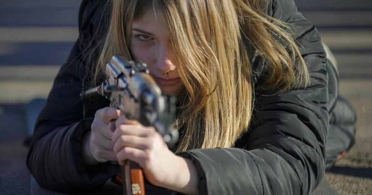 Μια φωτογραφία δείχνει μια νεαρή γυναίκα μπρούμητα ξαπλωμένη στο έδαφος και στηριγμένη στους αγκώνες της να στοχεύει μέσα από την κάννη ενός τουφεκιού κατά τη διάρκεια μιας εκπαίδευσης που οργανώθηκε από τη Μονάδα Ειδικών Δυνάμεων Azov, της Εθνικής Φρουράς της Ουκρανίας, στην πόλη Μαριούπολη στην ανατολική περιοχή του Ντονέτσκ της χώρας.