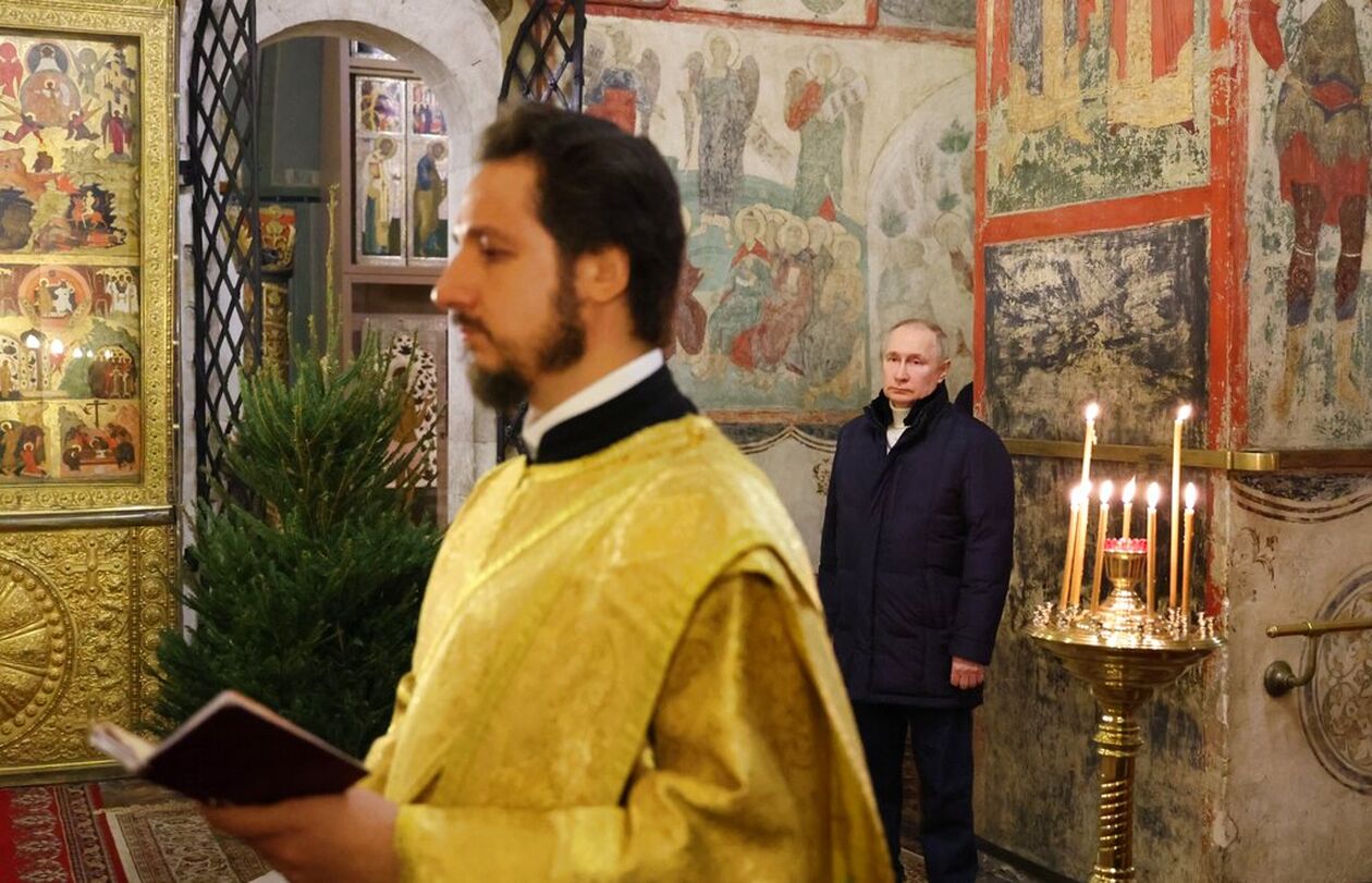 Η ρωσική τηλεόραση έδειξε για λίγο τον Βλαντίμιρ Πούτιν να παρακολουθεί μόνος τη χριστουγεννιάτικη λειτουργία στο Κρεμλίνο, φορώντας ένα λευκό πουλόβερ και μπλε μπουφάν, προτού συνδεθεί με τον καθεδρικό ναό του Σωτήρος Χριστού στη Μόσχα.