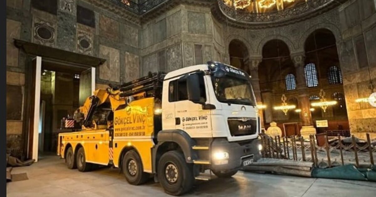 Πρωτοφανείς εικόνες με οχήματα βαρέος τύπου μέσα στην Αγία Σοφία, κάνουν τον γύρο του διαδικτύου.