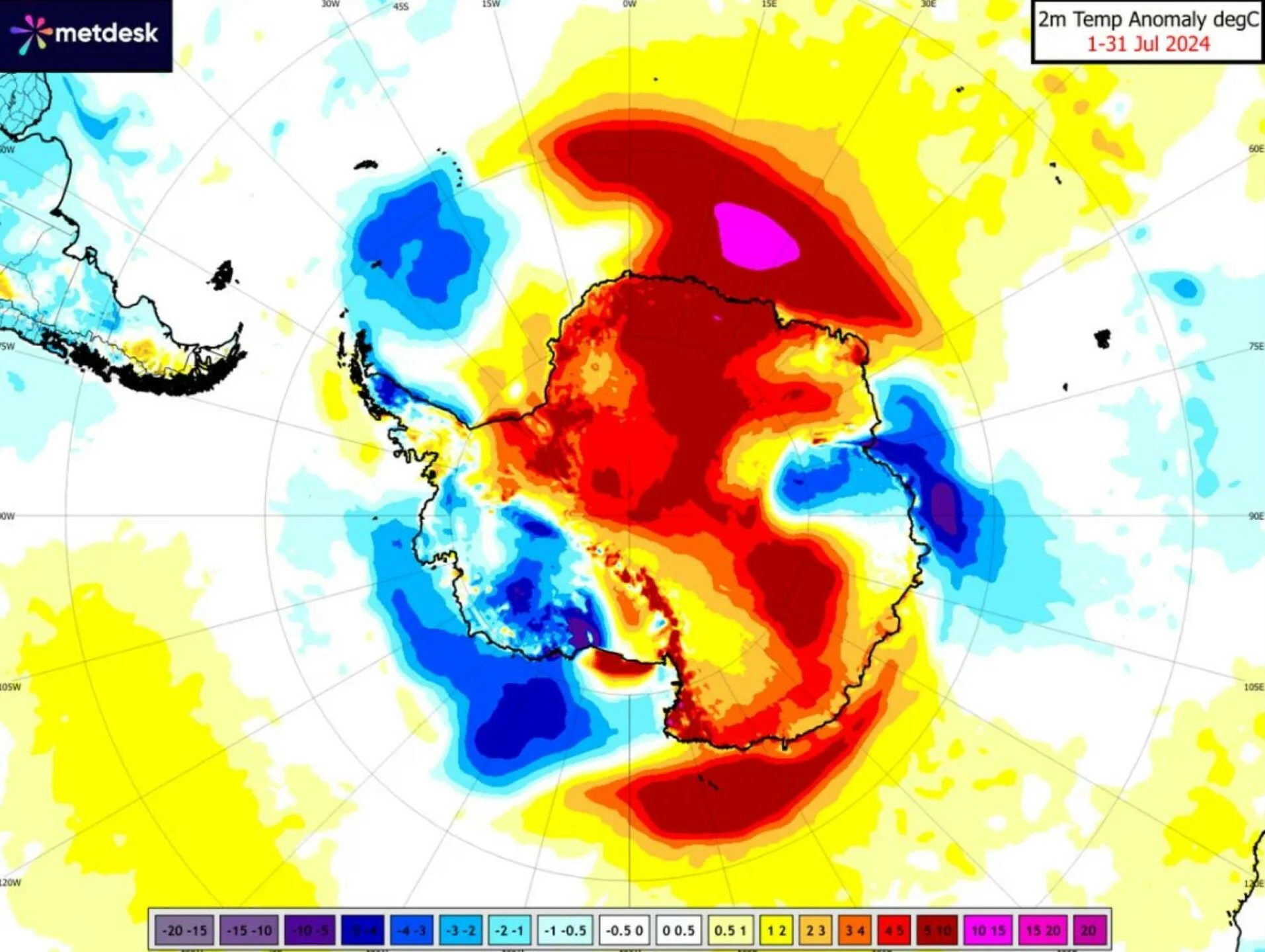 Ο περασμένος μήνας ήταν ο πρώτος έπειτα από 14 μήνες που δεν καταγράφηκαν ρεκόρ υψηλών θερμοκρασιών, αλλά ακολούθησε έναν εξαιρετικά ζεστό Ιούλιο το 2023 και παρέμεινε 0,3°C πάνω από οποιονδήποτε Ιούλιο στην Ιστορία. Ο Ζέικ Χαουζφάδερ, ερευνητής στο Berkeley Earth, είπε στον Guardian ότι ο καύσωνας της Ανταρκτικής ήταν «σίγουρα ένας από τους μεγαλύτερους παράγοντες στην απότομη αύξηση της παγκόσμιας θερμοκρασίας τις τελευταίες εβδομάδες».