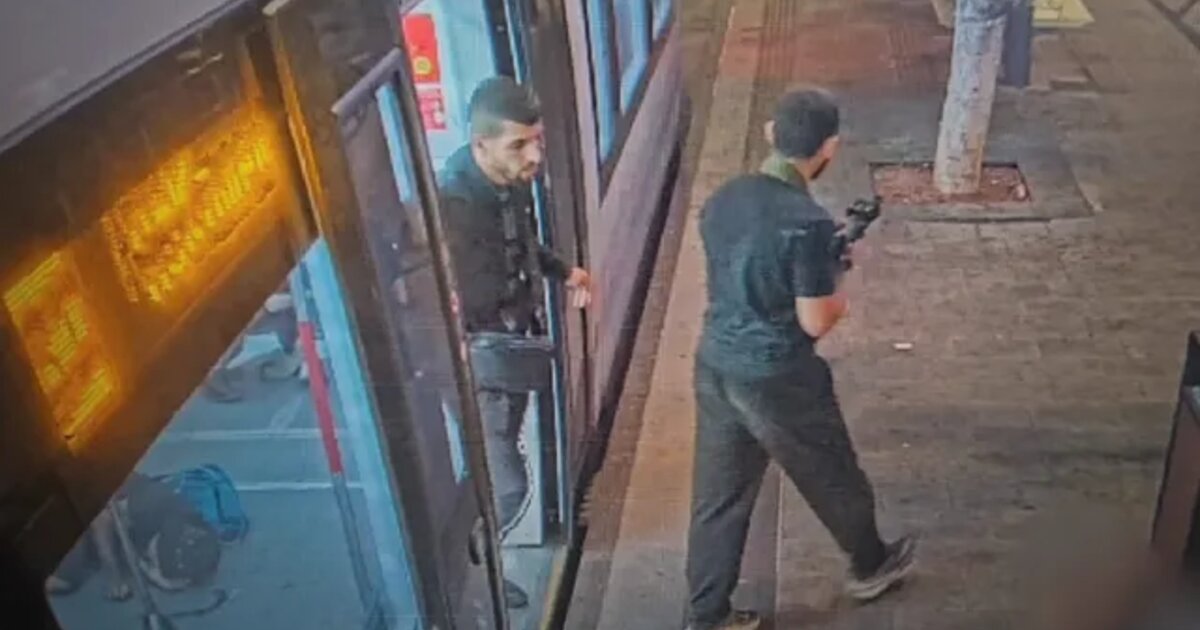 Οι εικόνες δείχνουν τους δύο άνδρες να βγαίνουν από το τρένο. Ο ένας φαίνεται να ανοίγει πυρ προς το σώμα ενός άνδρα που βρίσκεται στο έδαφος.
