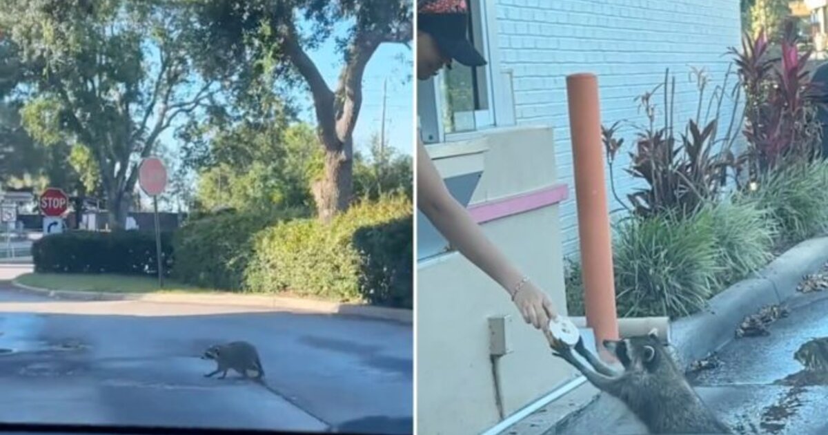 Η υπάλληλος του ντράιβ-θρου του δίνει ευγενικά ένα λευκό ντόνατ και αφού το παίρνει, το ρακούν φεύγει τρέχοντας με την λιχουδιά.