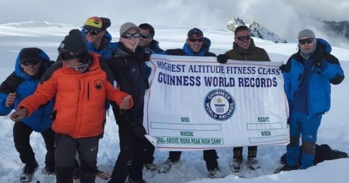 Ιδιοκτήτης βρετανικού γυμναστηρίου οδήγησε ομάδα ορειβατών στην κορυφή Μέρα, στο Νεπάλ σε μάθημα γυμναστικής διάρκειας 30 λεπτών σε υψόμετρο 6.476 μέτρων για να καταρρίψει παγκόσμιο ρεκόρ Γκίνες.