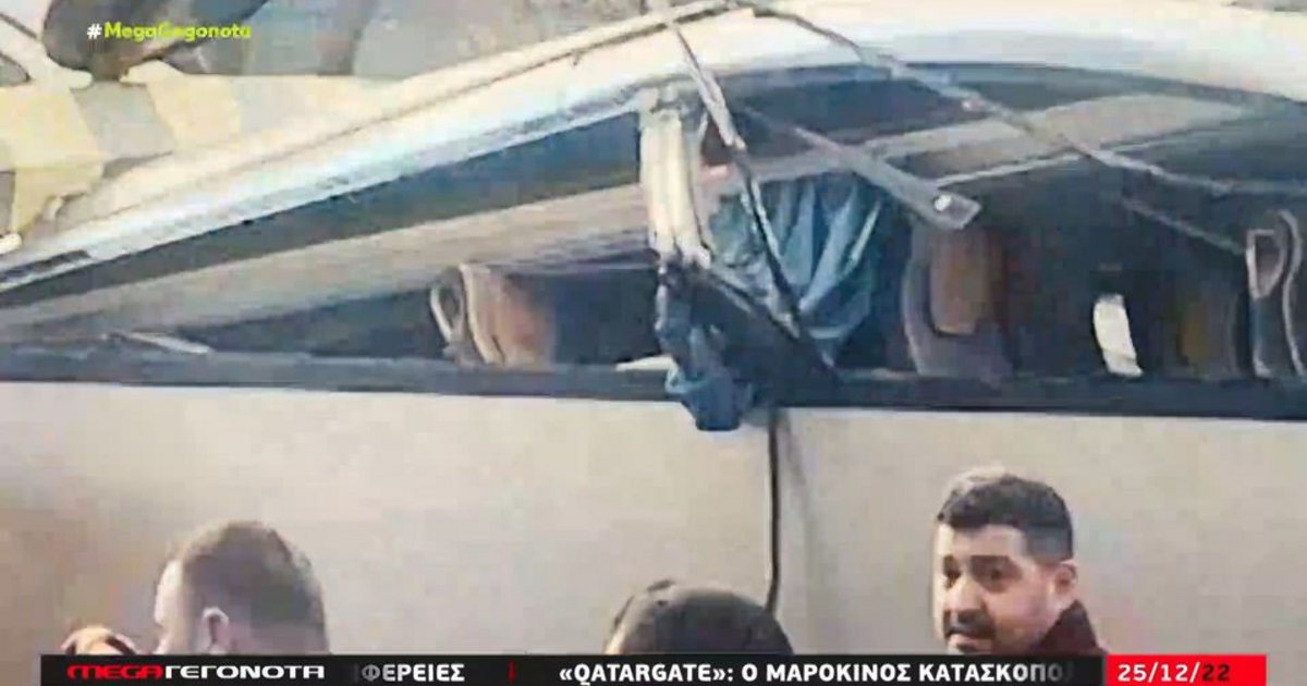 Πολλοί από τους 47 Έλληνες εγκλωβίζονται στα καθίσματά τους όταν η οροφή του πούλμαν κατέρρευσε από την πρόσκρουση.