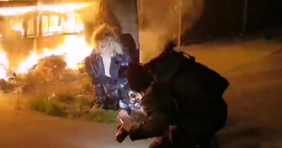 Στα social media κυκλοφόρησε το βίντεο με τη γυναίκα να είναι στο έδαφος και να ποζάρει, ενώ πίσω της μαίνεται η φωτιά που έχουν βάλει οι διαδηλωτές.