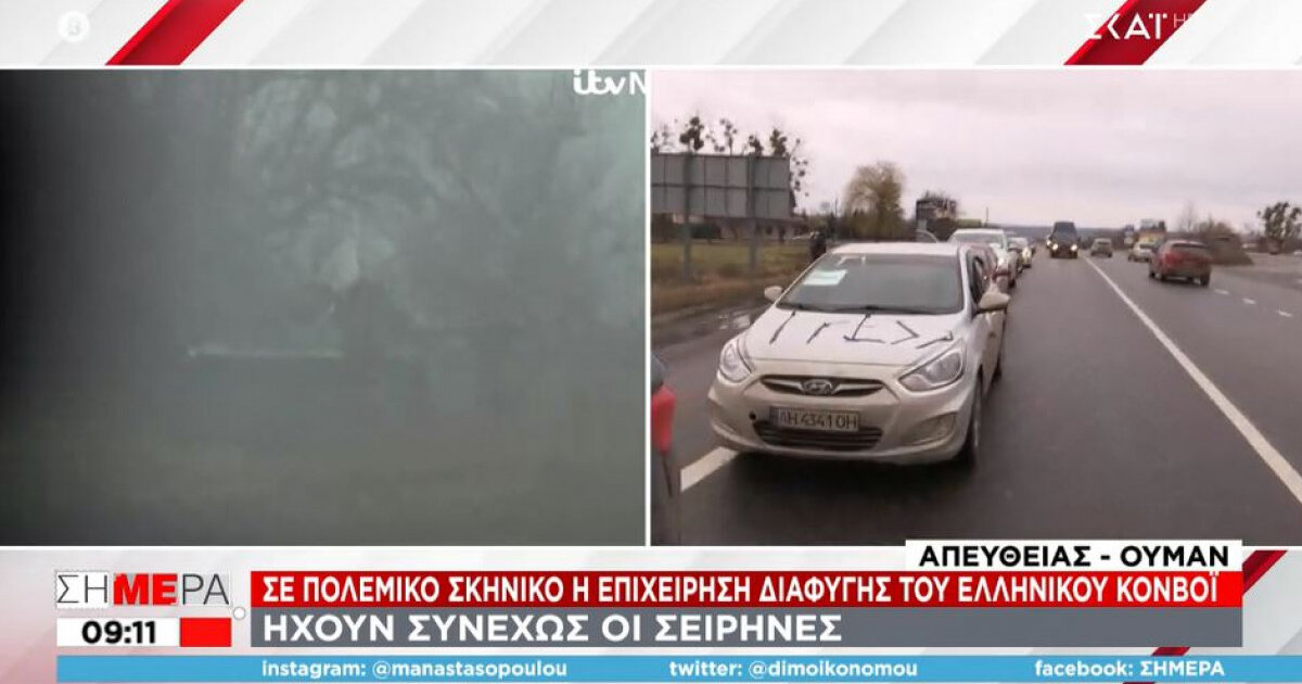 Όπως μεταδίδει ο απεσταλμένος του ΣΚΑΪ, Σταύρος Ιωαννίδης, αυτή τη στιγμή η αυτοκινητοπομπή των Ελλήνων βρίσκεται στην πόλη Ούμαν, όπου και διανυκτέρευσε λόγω των συνθηκών, και προσπαθεί να εφοδιαστεί καύσιμα για να συνεχίσει το ταξίδι της προς τα σύνορα της Μολδαβίας.