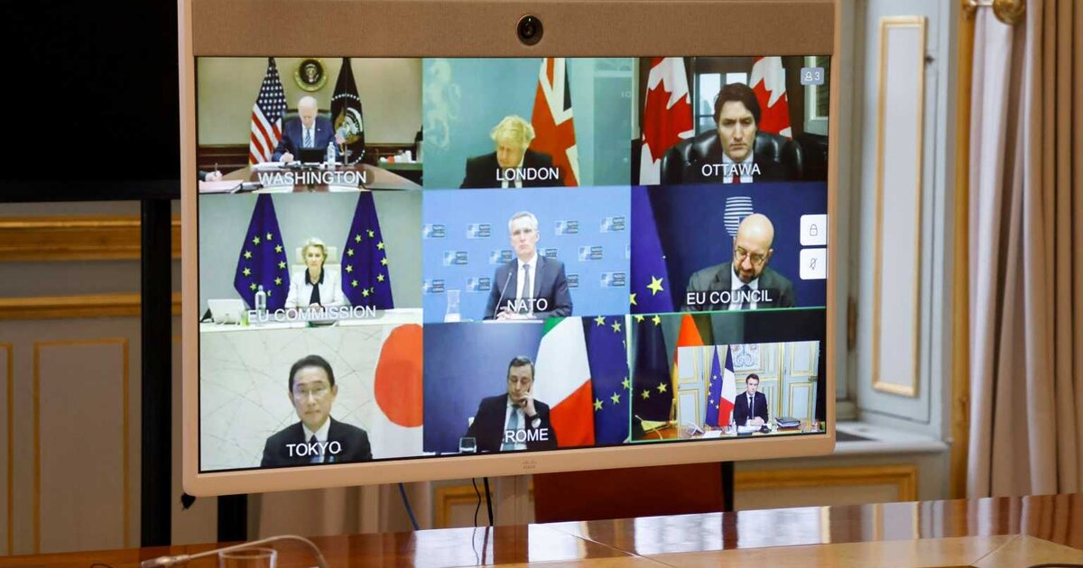 Σύμφωνα με Αμερικανό αξιωματούχο, η τηλεδιάσκεψη διήρκεσε λίγο περισσότερο από μία ώρα με συμμετέχοντες τους Τζο Μπάιντεν, Όλαφ Σολτς, Τζάστιν Τριντό, Εμανουέλ Μακρόν, Μάριο Ντράγκι, Φούμιο Κισίντα και Μπόρις Τζόνσον. Επίσης συμμετείχε η επικεφαλής της Κομισιόν, Ούρσουλα φον ντερ Λάιεν, ο πρόεδρος του Ευρωπαϊκού Συμβουλίου, Σαρλ Μισέλ και ο ΓΓ Γραματέας του ΝΑΤΟ, Γενς Στόλτενμπεργκ.