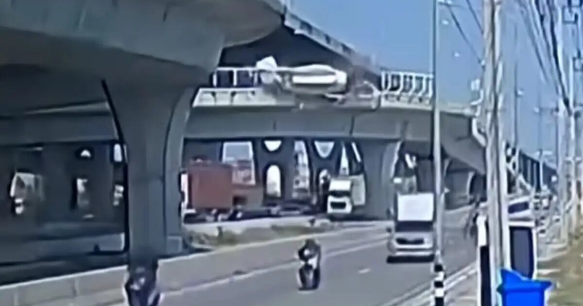 Συναγερμός σήμανε στις αρχές στην Ταϊλάνδη όταν ο οδηγός μιας μπετονιέρας έχασε τον έλεγχο και έπεσε από τη γέφυρα πάνω σε άλλα αυτοκίνητα. Το σοκαριστικό βίντεο δείχνει τη στιγμή που μια μπετονιέρα εκτρέπεται της πορείας της και πέφτει από υπερυψωμένο δρόμο στην Ταϊλάνδη.