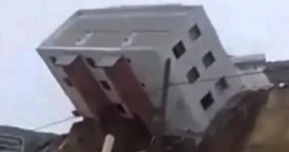 Στις εικόνες διακρίνεται το τριώροφο κτίριο να καταρρέει από λοφοπλαγιά το πρωί της περασμένης Κυριακής, να κάνει τούμπα και να καταλήγει σε δρόμο της πόλης Τιχουάνα στη Χρυσή Ακτή της Μπάχα Καλιφόρνια, στο δυτικό Μεξικό.