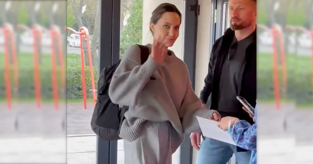 Με απλό ντύσιμο, ένα γκρι πουλόβερ και ένα σακίδιο πλάτης, η 46χρονη ηθοποιός εθεάθη σε καφετέρια της Λβιβ όπου τη βιντεοσκόπησε μια Ουκρανή, η Μάγια Πιντόρετσκα, η οποία ανάρτησε το βίντεο στον λογαριασμό της στο Facebook. "Πίνω τον καφέ μου στη Λβιβ και βλέπω την Αντζελίνα Τζολί, είναι τόσο όμορφη", σχολιάζει η χρήστρια του διαδικτύου
