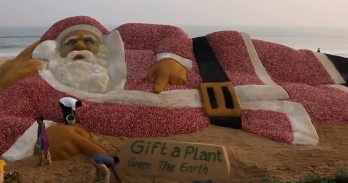 Ο εν λόγω καλλιτέχνης έφτιαξε τον πελώριο Άγιο Βασίλη με δύο τόνους κρεμμύδια και άμμο στην παραλία Πούρι της Ινδίας.