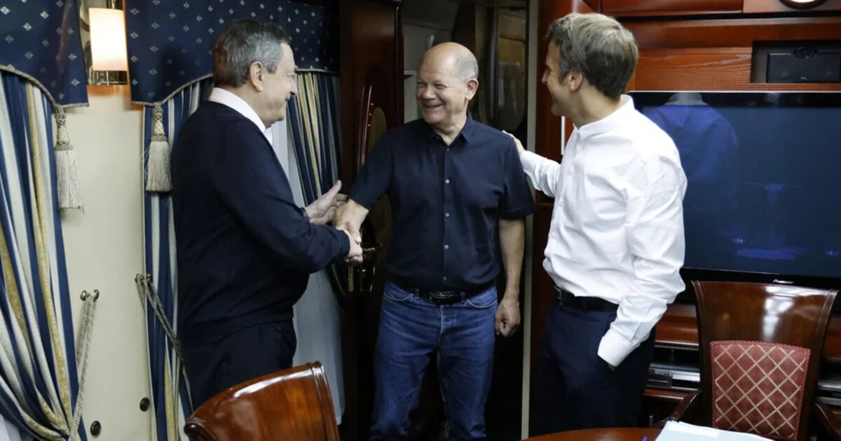 Λόγω του πολέμου ο εναέριος χώρος στην Ουκρανία είναι κλειστός κι έτσι οι ξένοι ηγέτες μόνον σιδηροδρομικώς μπορούν να μεταβαίνουν στο Κίεβο. Στον διάδρομο του συρμού κρέμεται μια αφίσα με τον τίτλο «τρένο διπλωματίας» με φωτογραφίες πολιτικών που επισκέφτηκαν το προηγούμενο διάστημα την ουκρανική πρωτεύουσα, μεταξύ άλλων της προέδρου της Κομισιόν, Ούρσουλα φον ντερ Λάιεν και των πρωθυπουργών της Βρετανίας και του Καναδά, Μπόρις Τζόνσον και Τζάστιν Τριντό. Σύντομα θα περιλαμβάνεται και εκείνη με τους Μακρόν, Σολτς και Ντράγκι.