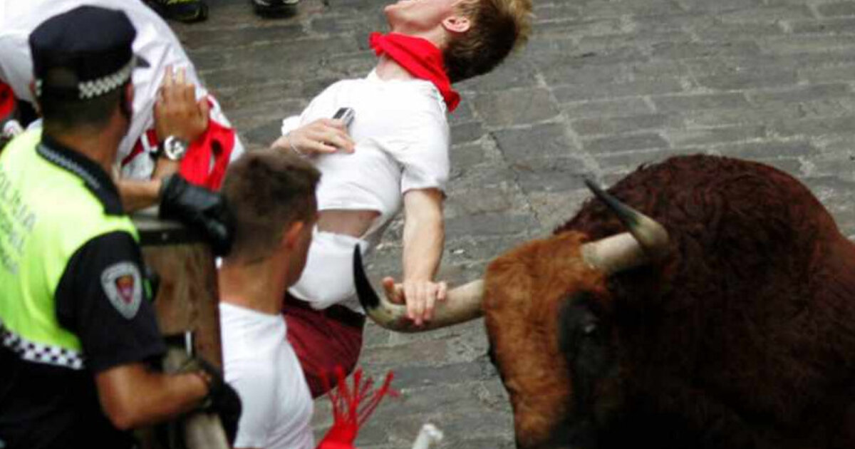 Δυστυχώς, όμως, για τον ίδιο όταν προσπάθησε να ανέβει σε έναν φράχτη για να προστατευτεί, έχασε τη λαβή του με αποτέλεσμα να πέσει στο οδόστρωμα δίνοντας έτσι την ευκαιρία στον ταύρο να του επιτεθεί.
