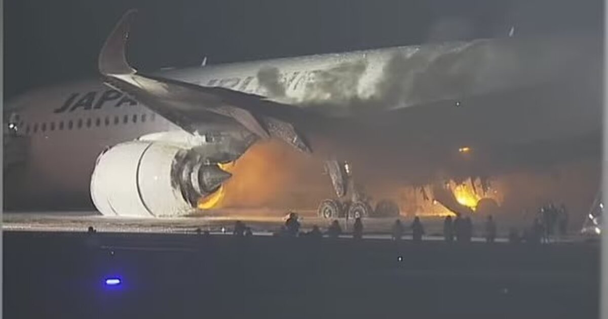 Βίντεο από τοπικό τηλεοπτικό σταθμό δείχνει μια μεγάλη έκρηξη πυρκαγιάς που ξέσπασε από την πλευρά ενός αεροπλάνου της Japan Airlines καθώς αυτό τροχοδρομούσε σε διάδρομο προσγείωσης.