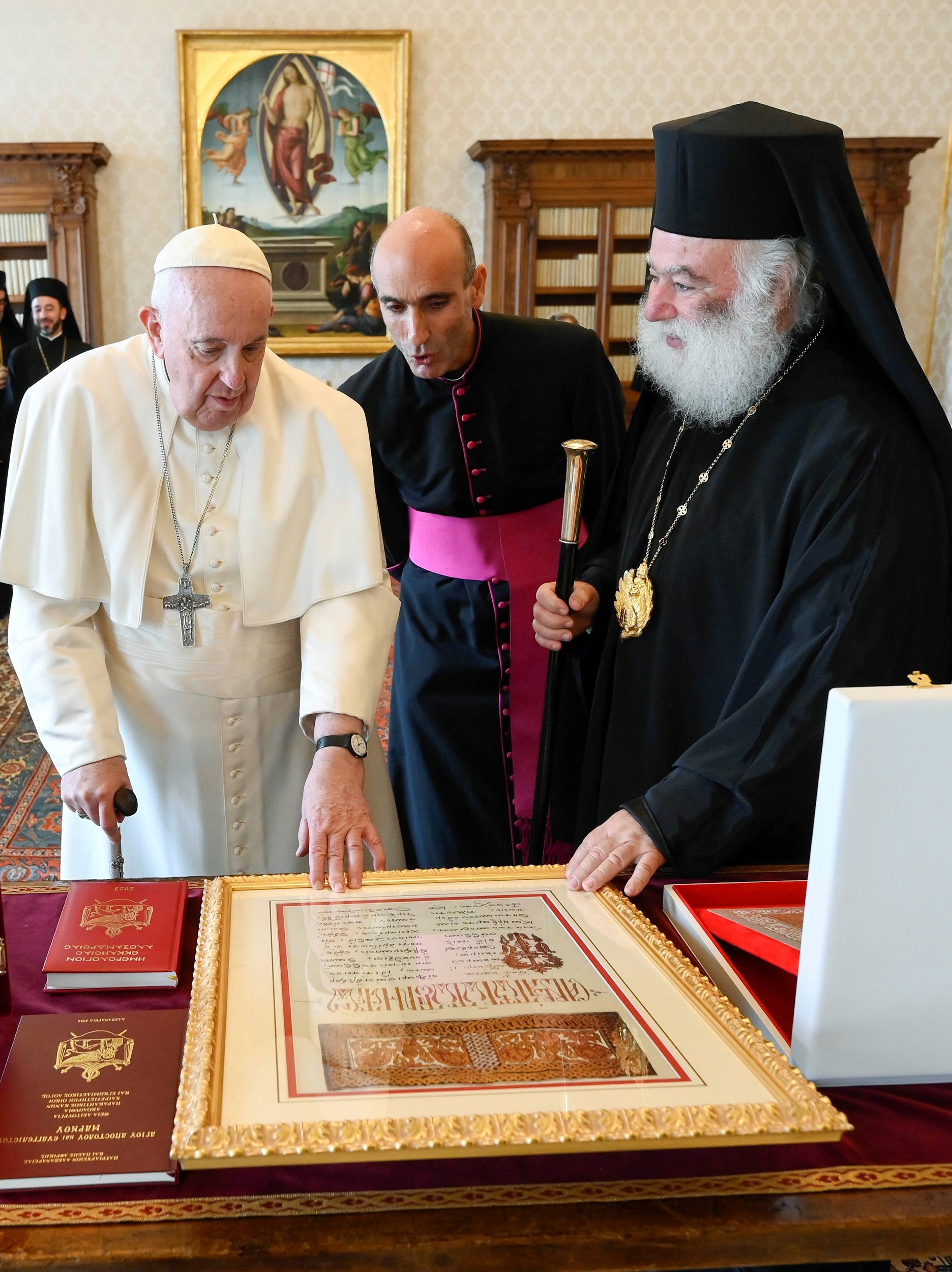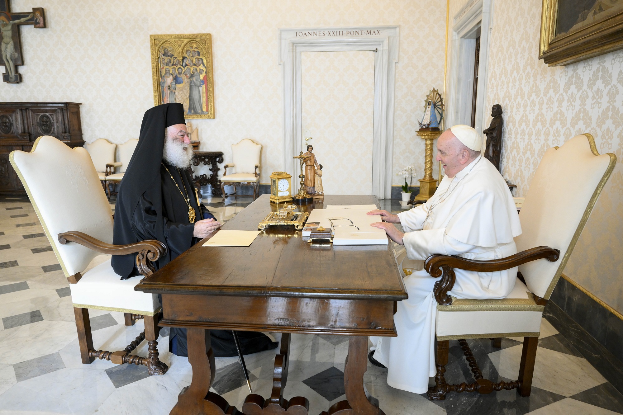 Στo πλαίσιo της επισκέψεως αυτής ο Μακαριώτατος συναντήθηκε το πρωί της 21ης Ιανουαρίου 2023 με την Α.Α. τον Πάπα κ.κ.Φραγκίσκο, στον οποίο παρουσίασε το πολυμερές ιεραποστολικό και ανθρωπιστικό έργο που αναπτύσσει το παλαίφατο Πατριαρχείο Αλεξανδρείας σε ολόκληρη της Αφρικανική ήπειρο, τα αντικειμενικά προβλήματα, ως και τα αναφυόμενα σε αυτό προσκόμματα.