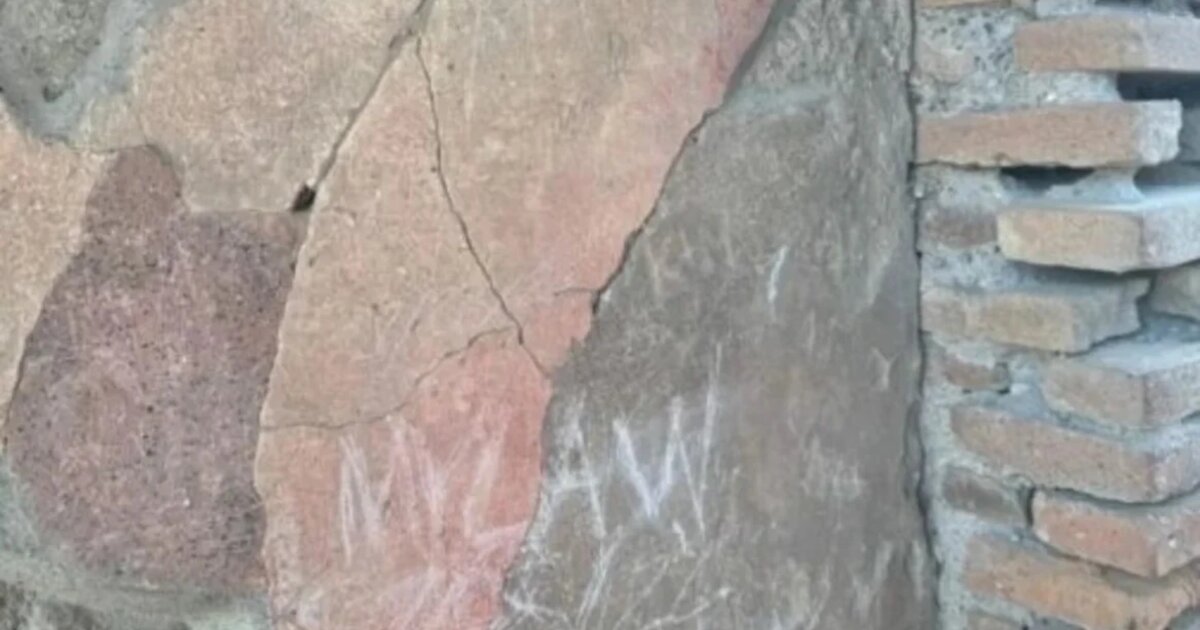 Οι φωτογραφίες της ζημιάς δείχνουν τα γράμματα χαραγμένα στον σοβά δίπλα στην πόρτα της εισόδου, πάνω σε ένα κόκκινο τοίχο 2.000 ετών.