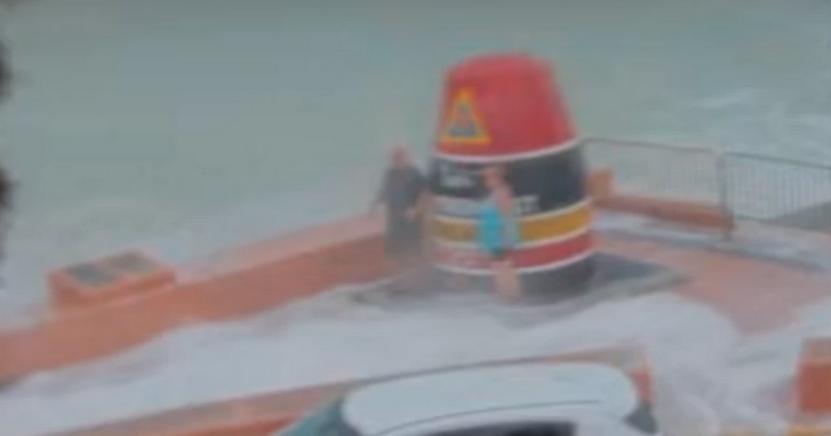 Σε βίντεο ένα ζευγάρι με μαγιό φαίνεται πως δεν ανησυχούν από τους πολύ ισχυρούς ανέμους και τα μεγάλα κύματα, η μανία των οποίων καθιστά δύσκολο ακόμη και να σταθούν όρθιοι.