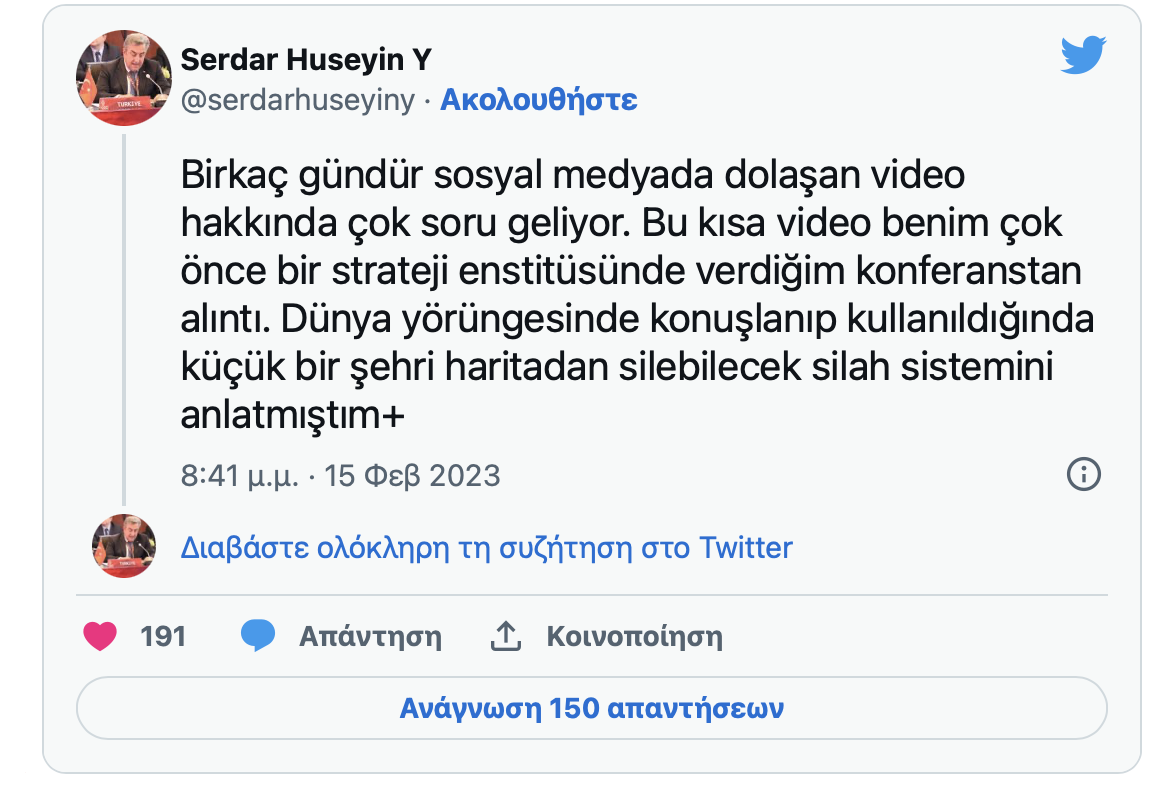 Μια δήλωση που προκάλεσε σάλο έκανε ο πρόεδρος της Τουρκικής Διαστημικής Υπηρεσίας, Σερντάρ Χουσεΐν Γιλντιρίμ, όταν μιλώντας σε ένα συνέδριο πριν από δύο ημέρες, έδωσε τη δική του εκδοχή για τους δύο φονικούς σεισμούς που χτύπησαν την Τουρκία και τη Συρία, αφήνοντας πίσω τους χιλιάδες νεκρούς και συντρίμμια.